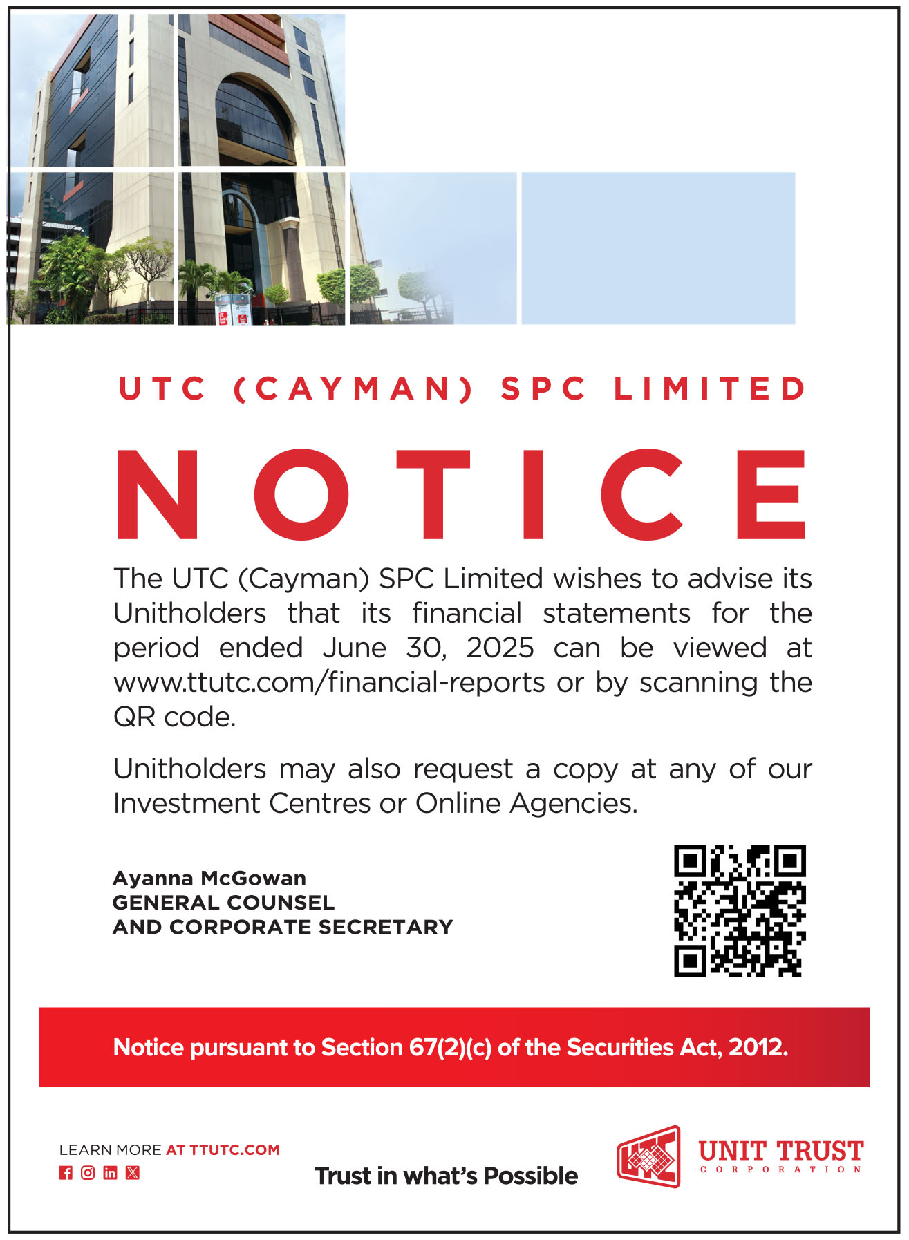 Notice: Financial Statements for the period ended June 30, 2025 – TTUTC & UTC (Cayman) SPC Limited